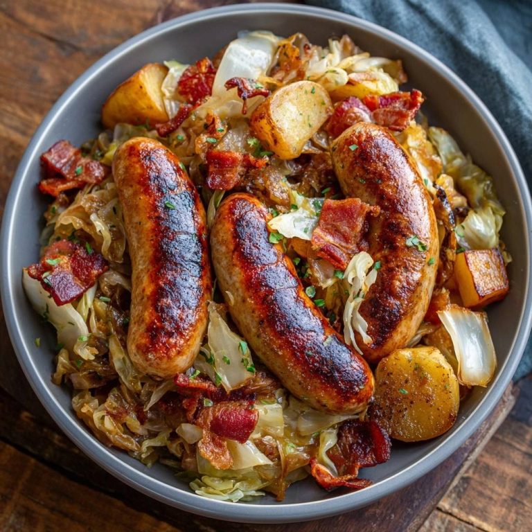 Knusprige Bratwurst-Pfanne mit Sauerkraut, Kartoffeln und Speck – saftig und trocken ohne wässrige Soße dank Profi-Trick!