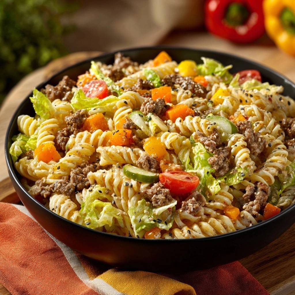 Stell dir vor, du beißt in diesen Salat rein: Die Fusilli knacken zwischen den Zähnen, das Hackfleisch schmilzt saftig auf der Zunge, und der Sesam knirscht herrlich. Frisches Gemüse bringt Farbe und Biss, alles in einem Duft nach gebratenem Fleisch und Sommer. Ich hab das Gericht letztens für Freunde gemacht, und die haben den Teller leer gelöffelt, ohne ein Wort zu sagen.