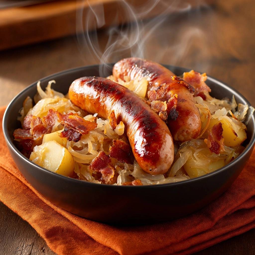 Der Biss in eine saftige Bratwurst, umhüllt von knackigem Sauerkraut und knusprigen Speckkartoffeln. Der Duft von angebratenem Kraut mit Kümmel hängt in der Küche, macht sofort hungrig. Letzte Woche hab ich das für die Familie gemacht, die Teller waren leer, bevor ich blinzeln konnte.
