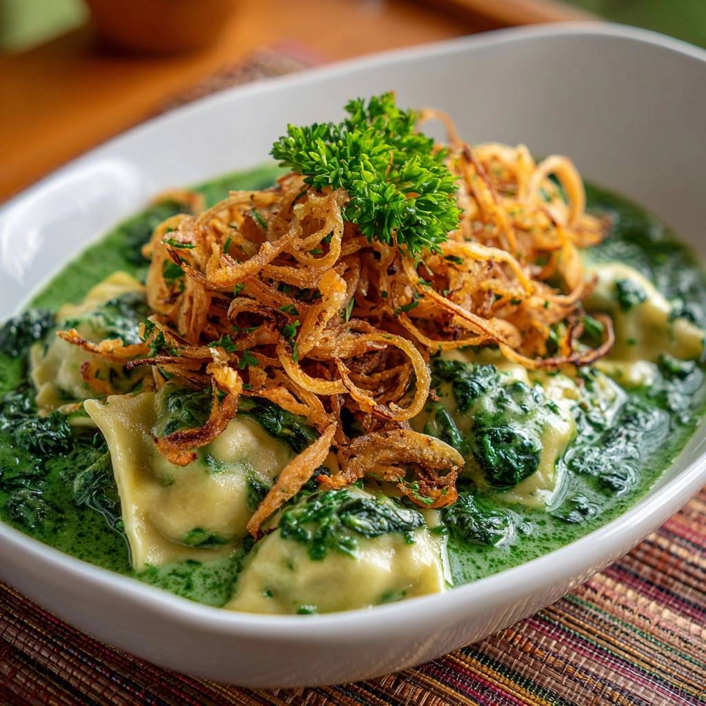 - Anrichten: Ravioli mit der cremigen Spinatsoße vermengen. Mit knusprigen Zwiebeln und gehackter Petersilie toppen. Sofort servieren – die Soße bleibt dick, die Ravioli saftig!