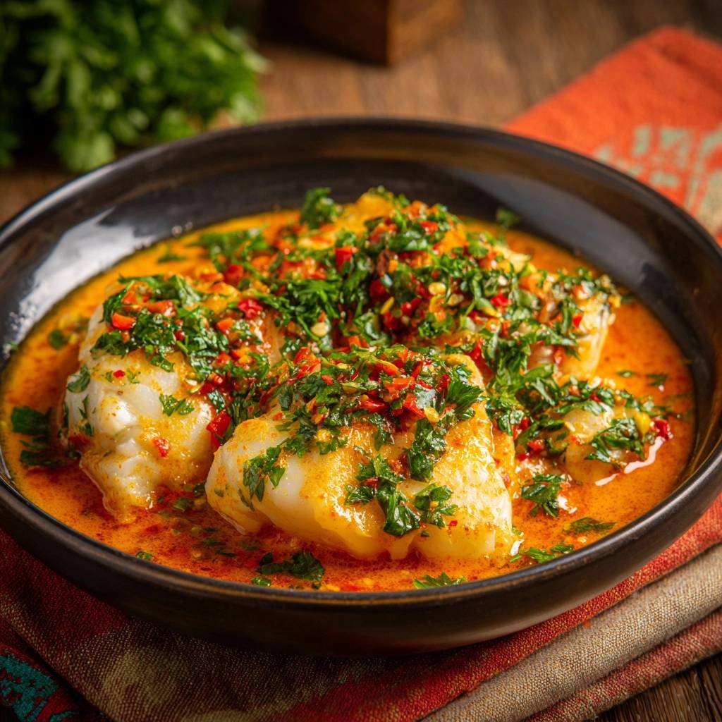 Die Sauce wird durch Kurkuma goldorange und aromatisch. Koriander balanciert die Schärfe. Ergebnis: Saftiger Fisch in cremiger Hülle, der nie zerfällt.