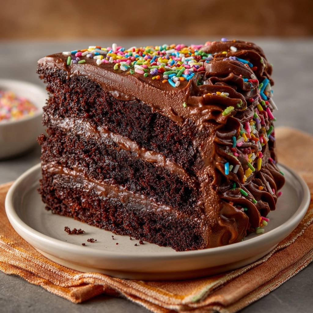 - Böden aufeinanderstapeln, dazwischen und außen großzügig mit Frosting bestreichen. Mit bunten Streuseln dekorieren. Mindestens 30 Minuten kühlen, damit alles stabil hält. Fertig – saftig, schokoladig und fehlerfrei!