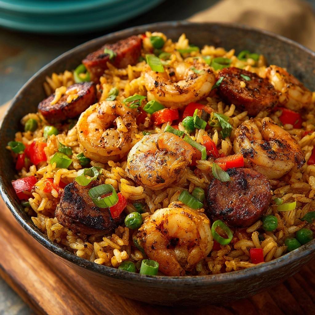Der Duft von gebratenen Garnelen mischt sich mit dem würzigen Aroma der Hähnchenwurst und knackigem Gemüse. Du spießt ein Stück Garnelenschwanz auf, der Reis daneben ist fluffig und getrennt, gar nicht matschig. Jeder Bissen explodiert vor Geschmack, saftig und herzhaft zugleich.