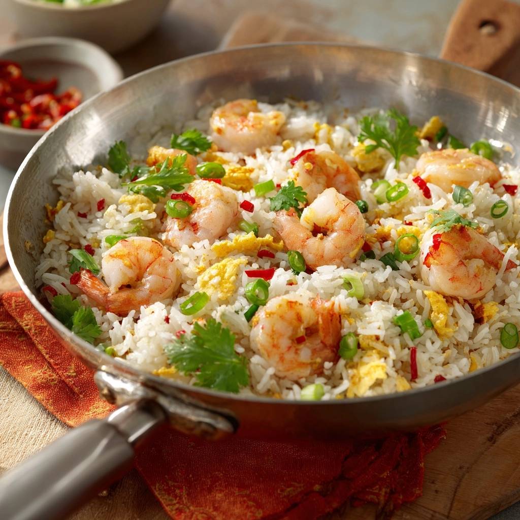 Stell dir vor, du spießt eine Garnele auf, beißt rein und der saftige Biss explodiert mit knusprigem Reis, der sich perfekt löst. Der Duft von frischem Koriander und Chili steigt auf, während die Erbsen knackig bleiben. Das ist Fried Rice, wie er sein soll: locker, aromatisch und in 20 Minuten fertig.