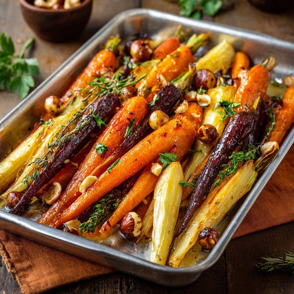 - Aromatisierung: Verteilen Sie die Thymianzweige und die Haselnüsse (ganz und gehackt) zwischen den Möhren. Die Nüsse rösten im Öl-Honig-Gemisch mit und geben ihr Aroma direkt an das Gemüse ab.