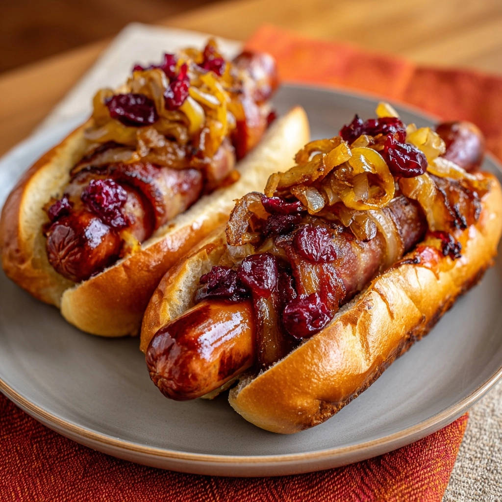 - Anrichten und Genießen: Bestreichen Sie die getoasteten Brötchen optional leicht mit scharfem Senf. Legen Sie jeweils eine perfekt gegarte Bacon-Wurst hinein. Reichlich karamellisierte Zwiebeln darauf verteilen und mit dem fruchtig-herben Cranberry-Topping krönen. Sofort servieren und das Geschmackserlebnis genießen!