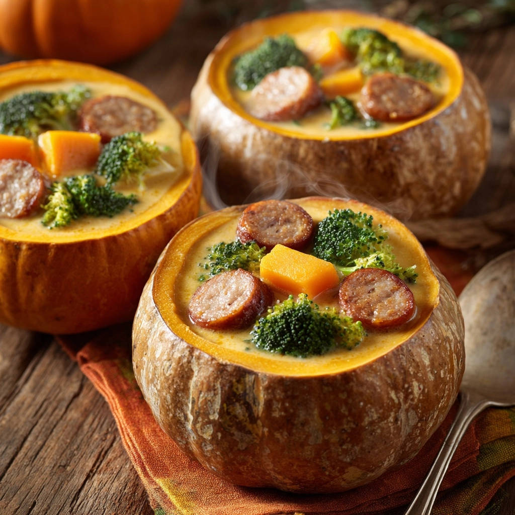 Diese Herzhafte Kürbis-Suppen-Schalen mit Wurst und Brokkoli sind mehr als nur ein Rezept – sie sind ein Erlebnis, das den Herbst in seiner schönsten Form auf Ihren Tisch bringt.
