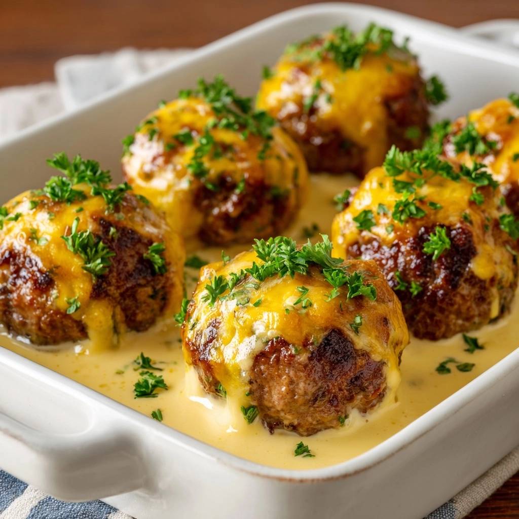 Stell dir vor, du beißt in eine Fleischbällchen, und statt trockenem Gummi explodiert pure Saftigkeit im Mund. Die goldene Käsekruste knackt, darunter cremige Sahnesoße, die alles umhüllt. Genau das passiert mit diesen Käseüberbackenen Fleischbällchen in Sahnesoße.