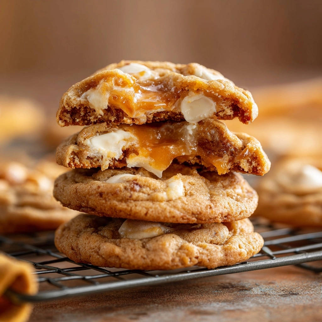 Die Ränder sollten leicht goldbraun sein, aber die Mitte der Cookies muss noch sehr weich und fast untergebacken aussehen. Dieser leichte Untergarpunkt ist entscheidend, damit der Karamell seine flüssige Konsistenz behält und die Cookies wunderbar saftig bleiben.