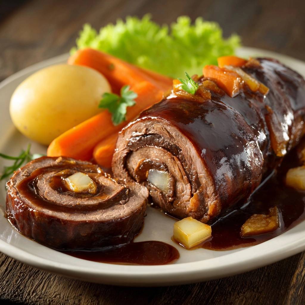 - Anrichten: Schneiden Sie eine Roulade schräg an, um die Füllung zu präsentieren. Richten Sie sie mit den ganzen Salzkartoffeln und den in Stifte geschnittenen, gedünsteten Karotten an. Übergießen Sie das Fleisch großzügig mit der glänzenden Reduktion und garnieren Sie mit frischer Petersilie.