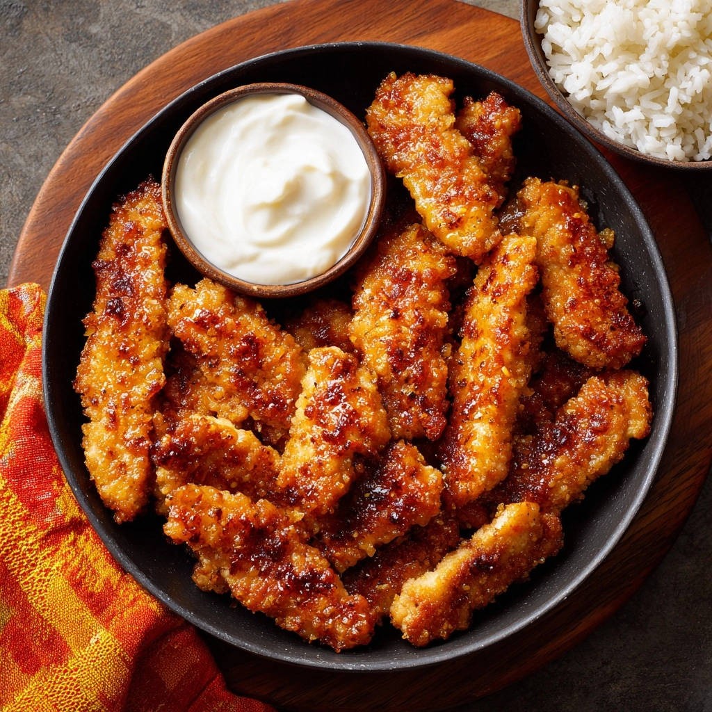Servieren Sie die knusprigen Honig-Chili Hähnchen-Streifen zusammen mit dem cremigen Dip und dem gekochten Reis heiß. Guten Appetit!