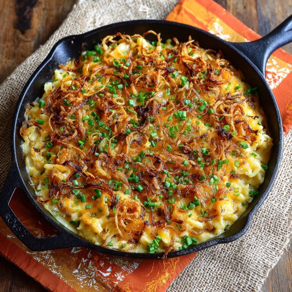 - Knusprige Zwiebelringe und Frühlingszwiebeln gleichmäßig drüberstreuen – HIER der Knusprigkeits-Trick: Zwiebeln nicht zu früh zugeben, sondern jetzt frisch rösten. Pfanne unter den Grill (250 °C) für 5-7 Minuten schieben, bis alles goldbraun blubbert und knusprig wird. Nicht umrühren, damit die Kruste hält!