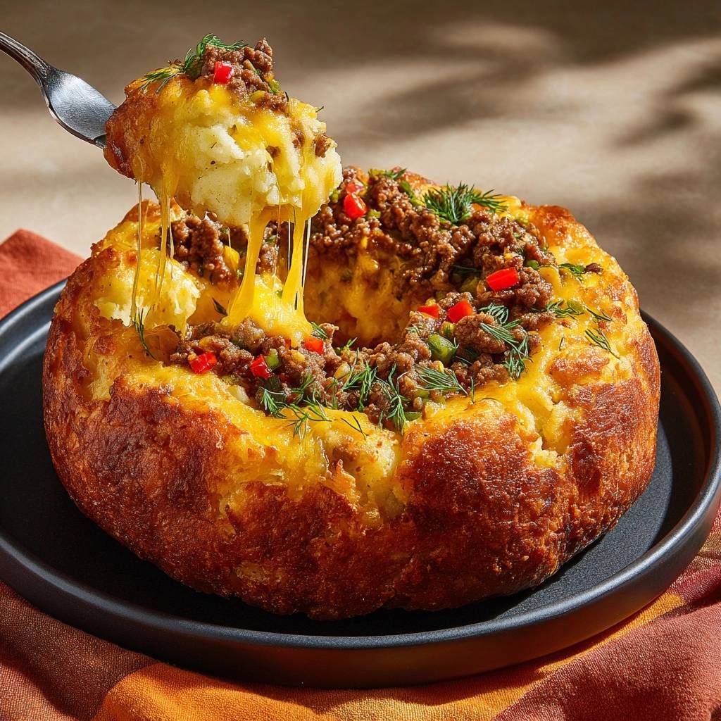 Stell dir vor, du schneidest den ersten Stück aus diesem Ring ab. Die Kruste knackt so herrlich, dass es durch die Küche knistert. Drinnen wartet cremiges Kartoffelpüree, das mit saftigem Rindfleischhack, knackiger Paprika und frischem Dill gefüllt ist. Der Käse schmilzt noch ein bisschen nach, zieht alles zusammen.