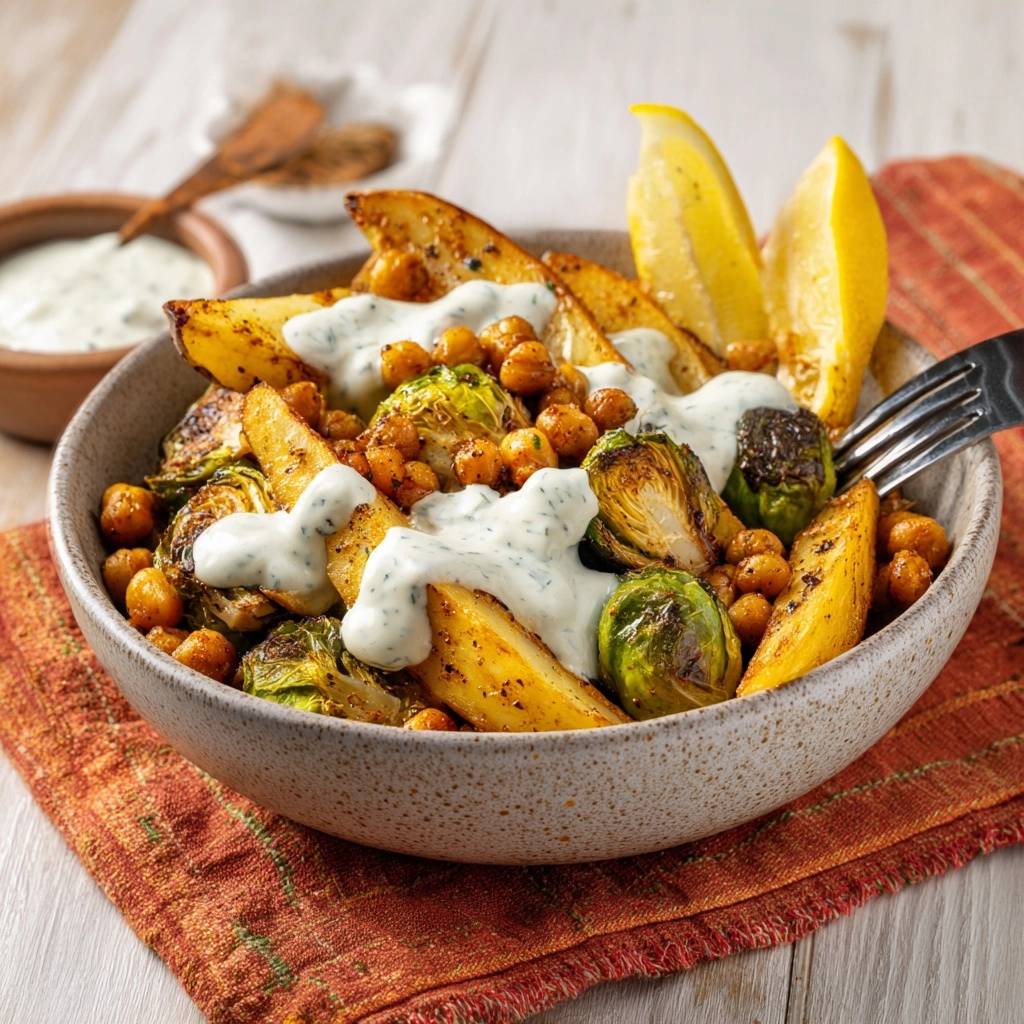 Knuspriger Rosenkohl-Bowl mit Kichererbsen & Kartoffelwedges