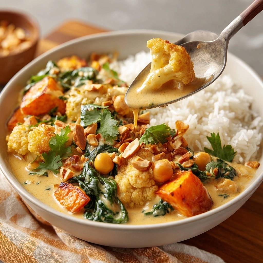 Stell dir vor, du löffelst das erste Mal in dieses cremige, gelbe Curry. Der Blumenkohl knuspert goldbraun unter deinen Zähnen, während die weichen Süßkartoffeln und knackigen Kichererbsen im Kokosmilchbad baden. Frischer Spinat bringt Biss, und der Duft von geröstetem Kurkuma macht dich wahnsinnig.