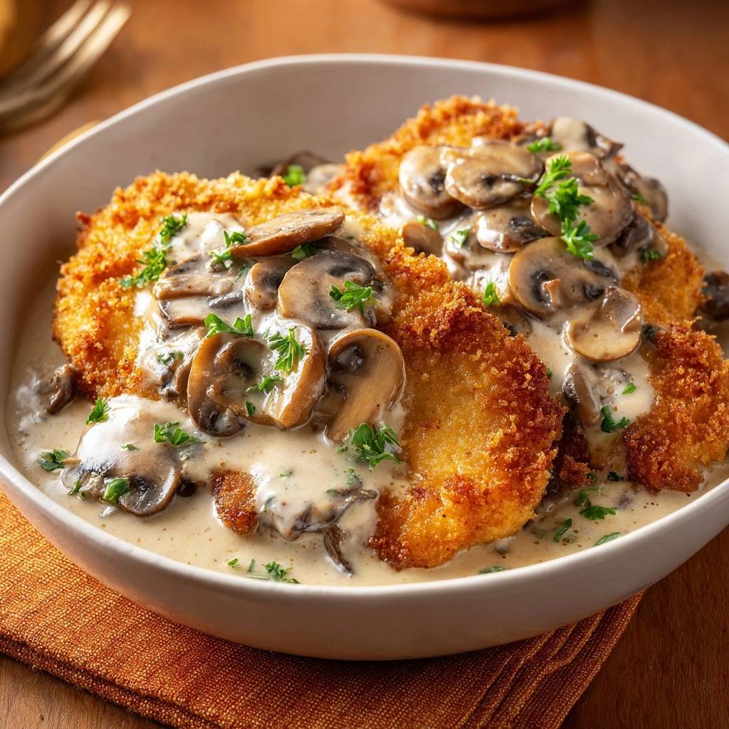 Knuspriges Hähnchenschnitzel mit Champignon-Rahmsoße