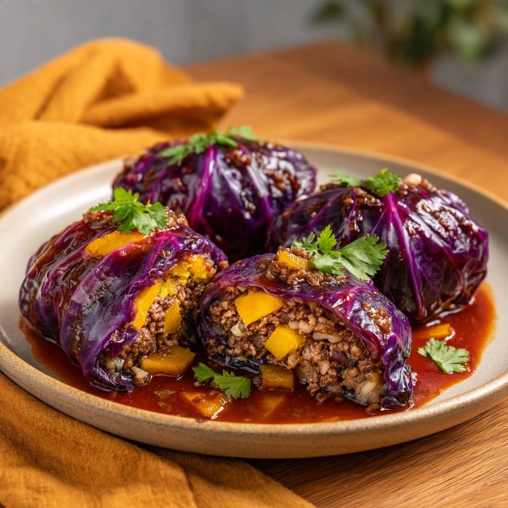 Stell dir vor, du beißt in eine Rotkohlroulade, die perfekt gerollt bleibt. Saftiges Hack mit süßer Mango explodiert im Mund, umhüllt von glänzender Sauce. Der Duft von Ingwer und Knoblauch zieht durch die Küche, und nichts fällt auseinander.