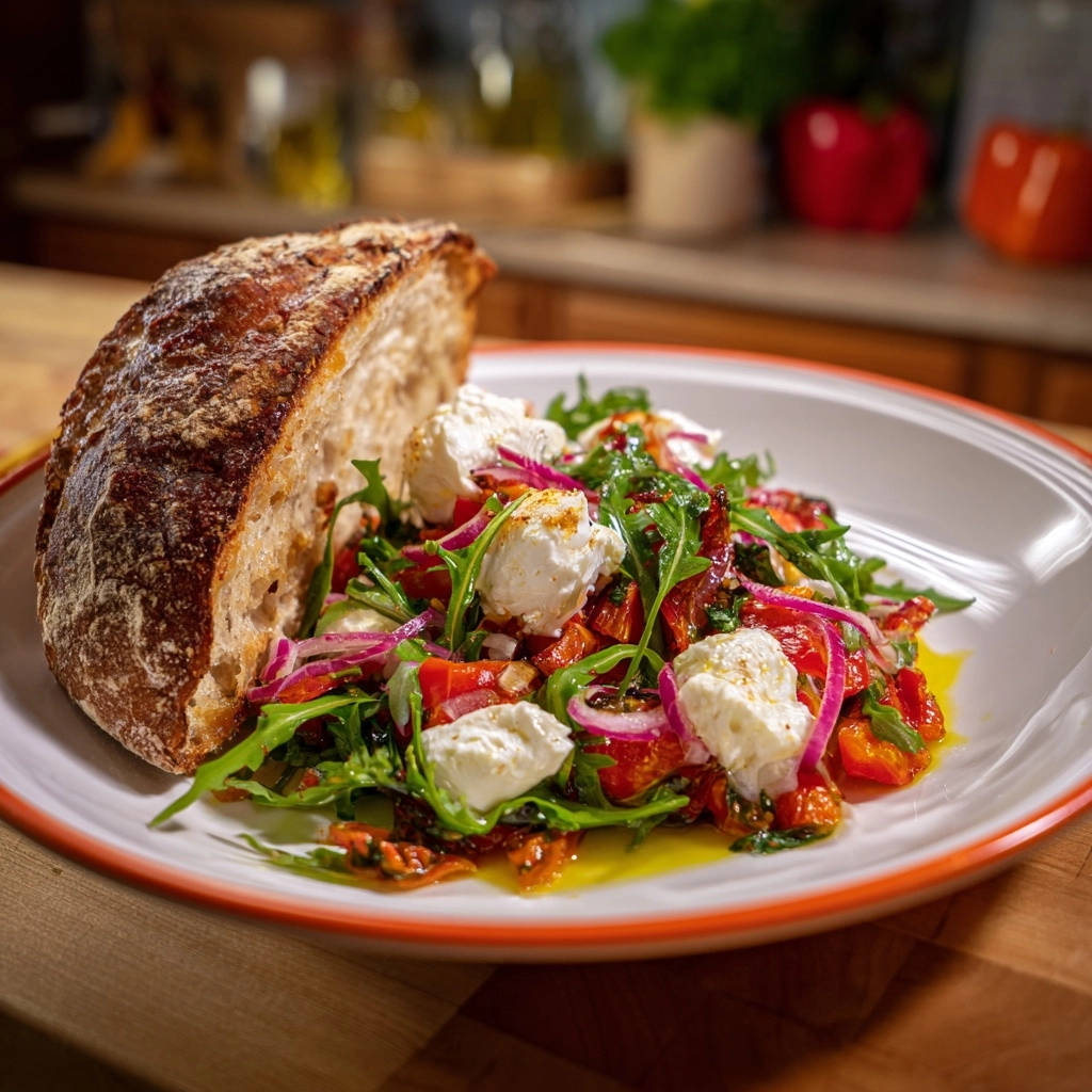 - Serviere den mediterranen Rucola-Salat sofort mit einer Scheibe des rustikalen Brotes, das perfekt ist, um den aromatischen Saft am Tellerboden aufzutunken. Guten Appetit!