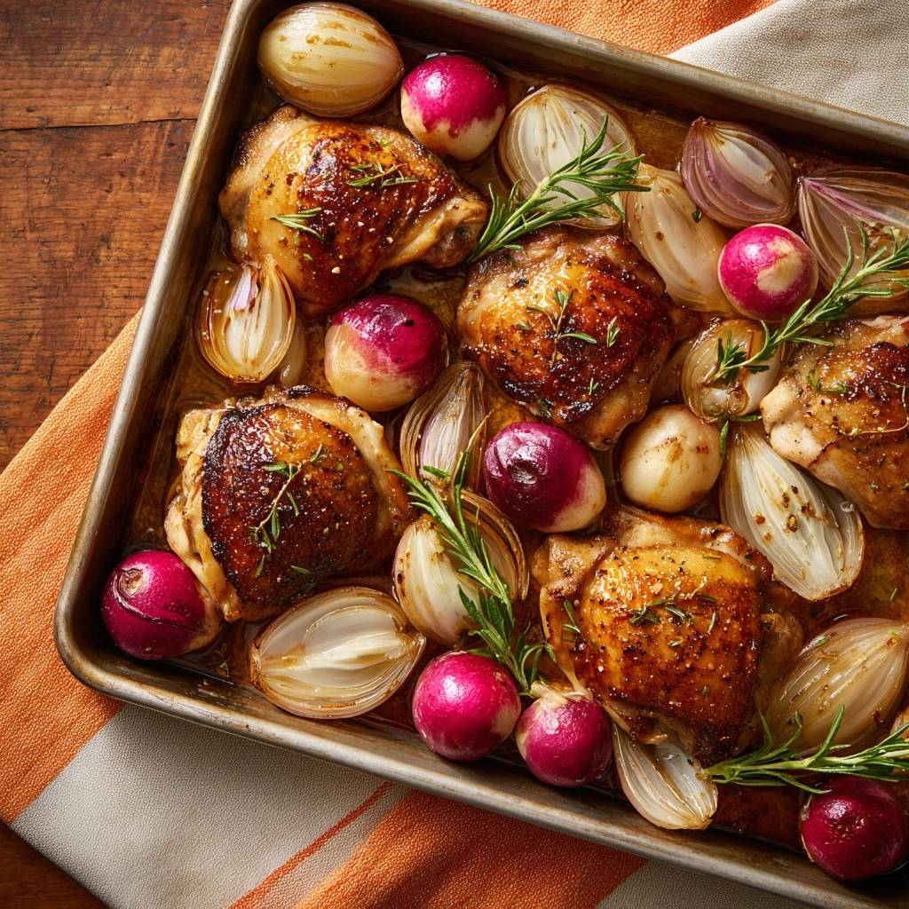 Ofengeröstete Hähnchenschenkel mit Schalotten & Radieschen