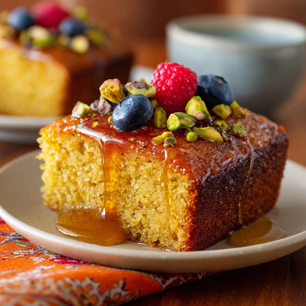 Stell dir vor, du beißt in diesen Pistazien-Sirupkuchen mit Beeren. Die Kruste knackt leicht, dann flutet pure Saftigkeit deinen Mund. Pistazienduft mischt sich mit fruchtiger Beerennotiz, und jede Gabel füllt sich mit zartem Grießteig, der nie trocken wird.