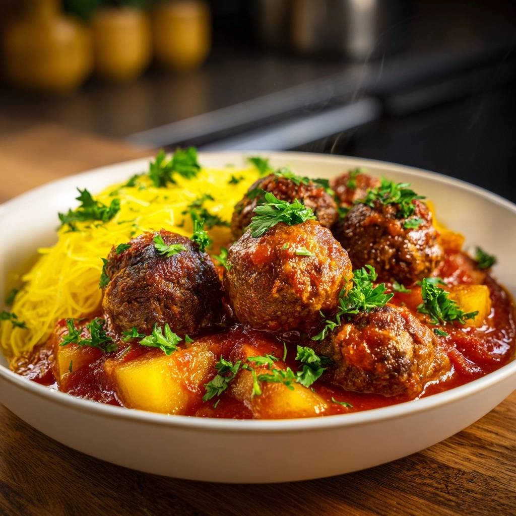 Stell dir vor, du nimmst die erste Gabel saftige Fleischbällchen mit Safrannudeln. Der Biss explodiert vor Saft, die goldene Kruste gibt nach, und drin ist alles fluffig und aromatisch. Der Duft von Kreuzkümmel und frischer Petersilie mischt sich mit der cremigen Tomaten-Kürbis-Sauce, die die gelben Safrannudeln umhüllt. Das ist pure Wohlfühlküche, die dich umarmt.