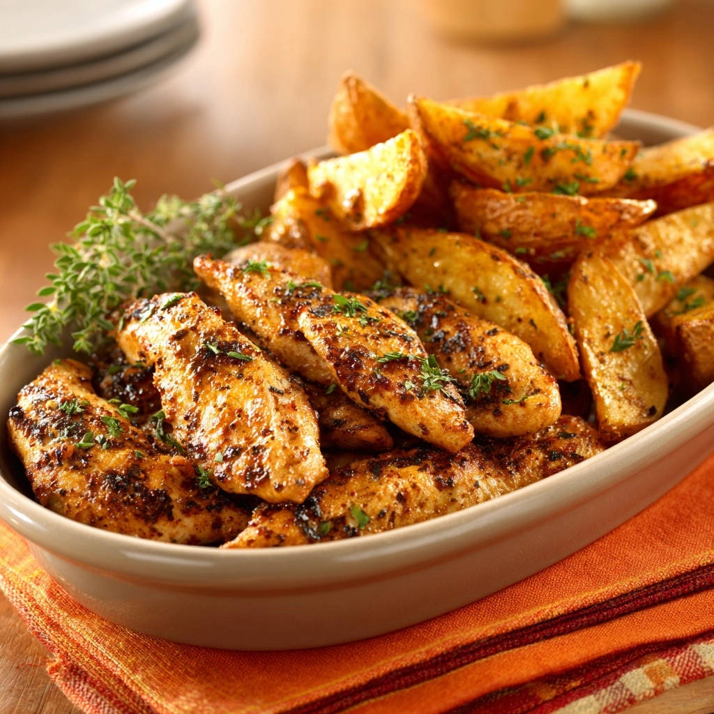 Saftige Hähnchen-Streifen mit knusprigen Kartoffelecken