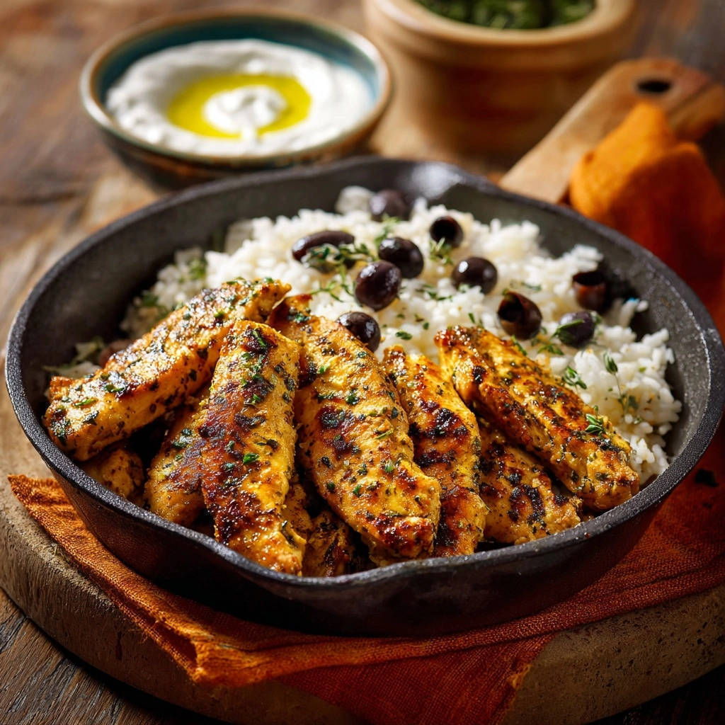 Saftige Hähnchenstreifen mit Kräuterreis und Oliven