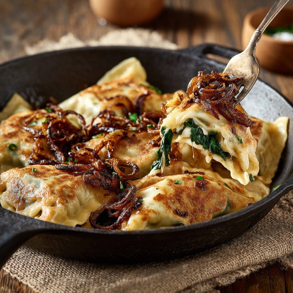 Spinat-Käse-Teigtaschen mit Knusprigen Röstzwiebeln