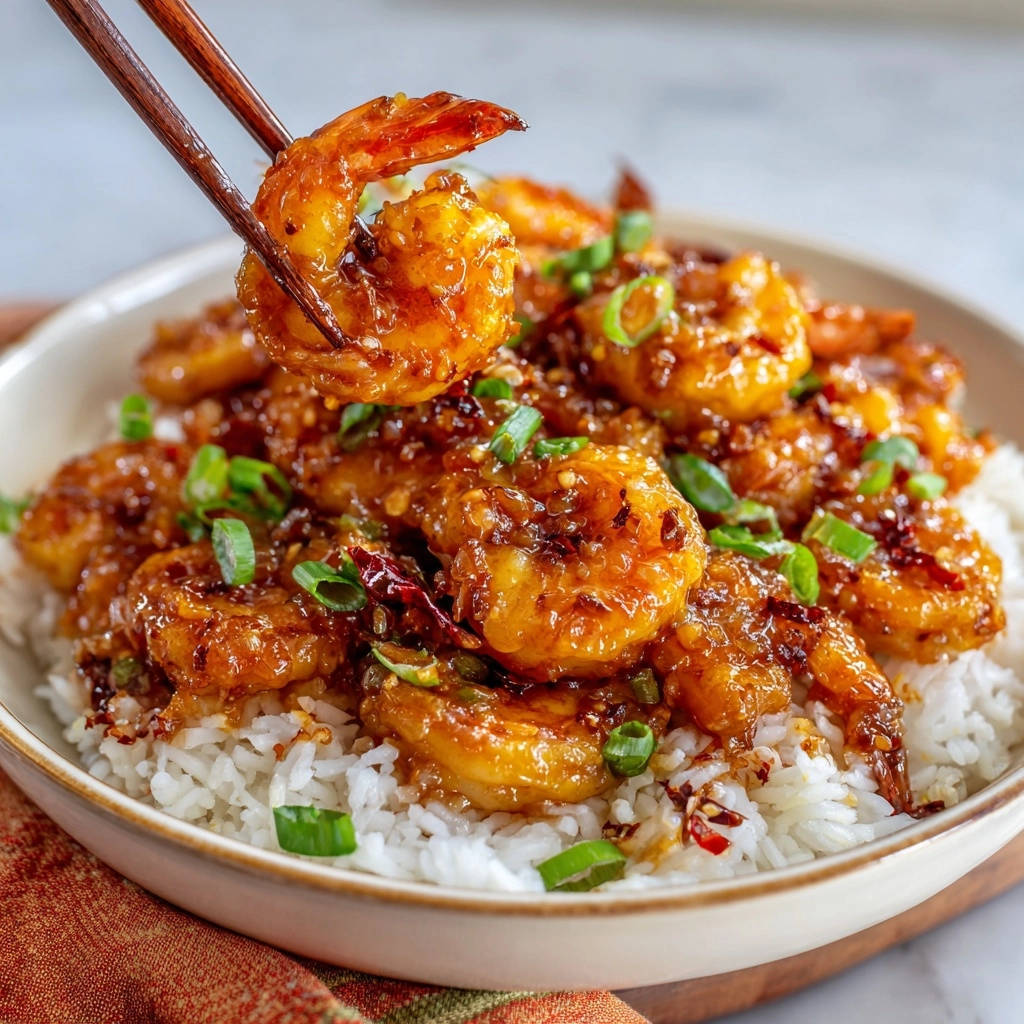 Servieren Sie die Würzige Honig-Chili Garnelen mit Reis sofort über heißem, lockerem Jasminreis.