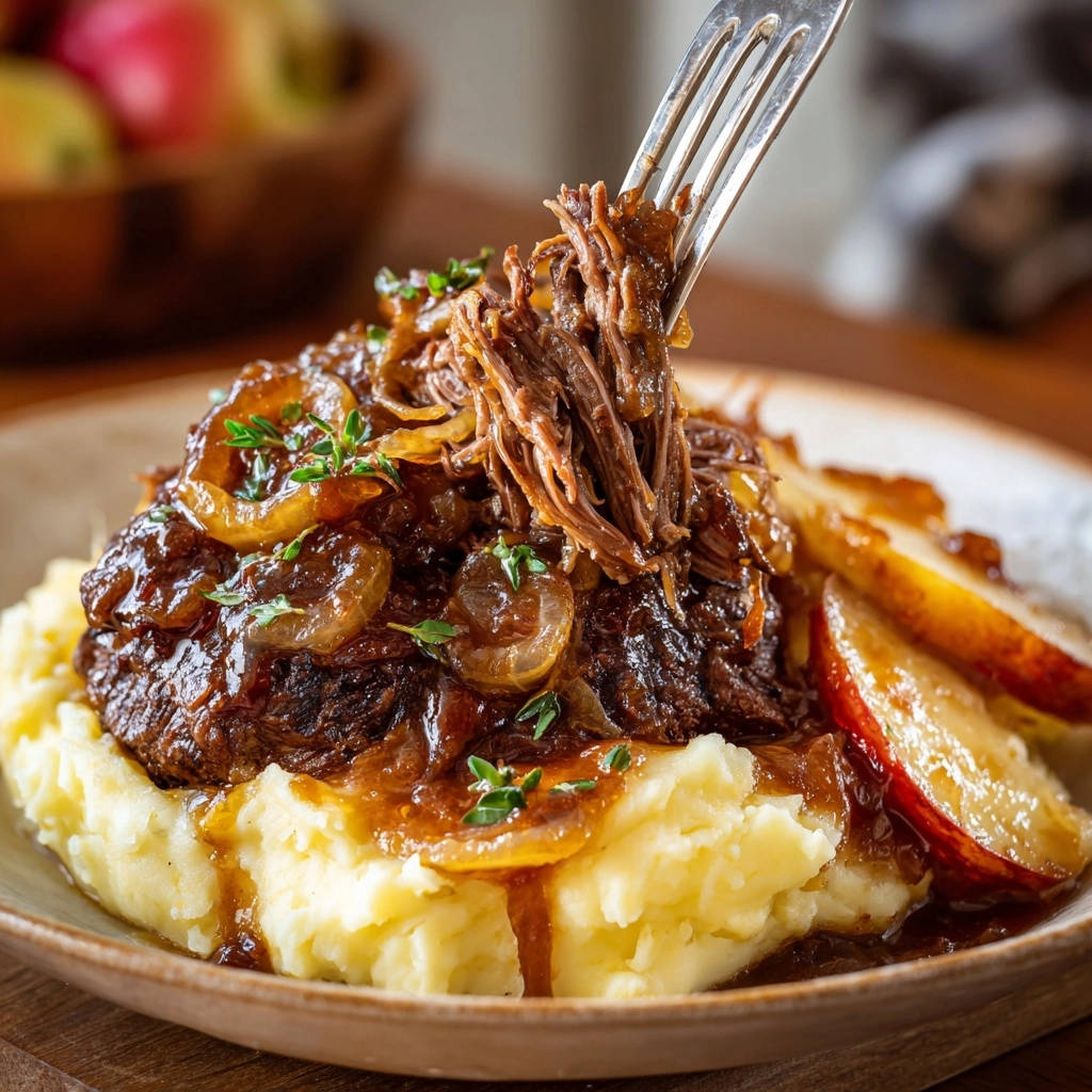 - Den zarten Rinderschmorbraten mit der köstlichen Soße und den karamellisierten Zwiebeln auf dem cremigen Kartoffelstampf anrichten. Die karamellisierten Äpfel danebenlegen und alles mit frischem Thymian garnieren. Lasst es euch schmecken!