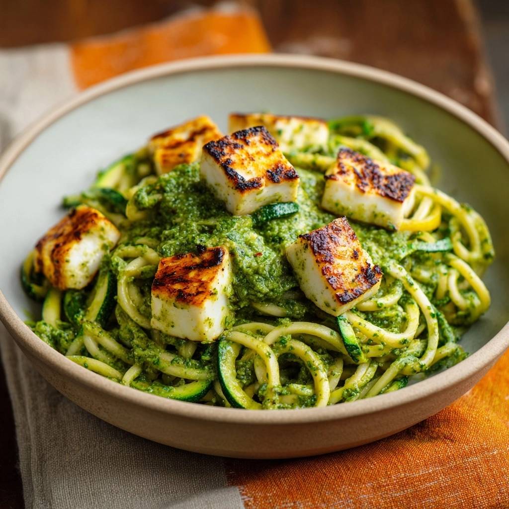 Vermenge die Zoodles mit dem Pesto. Richte in Schalen an, lege den knusprigen Feta obendrauf. Serviere sofort, damit alles saftig und knackig bleibt.